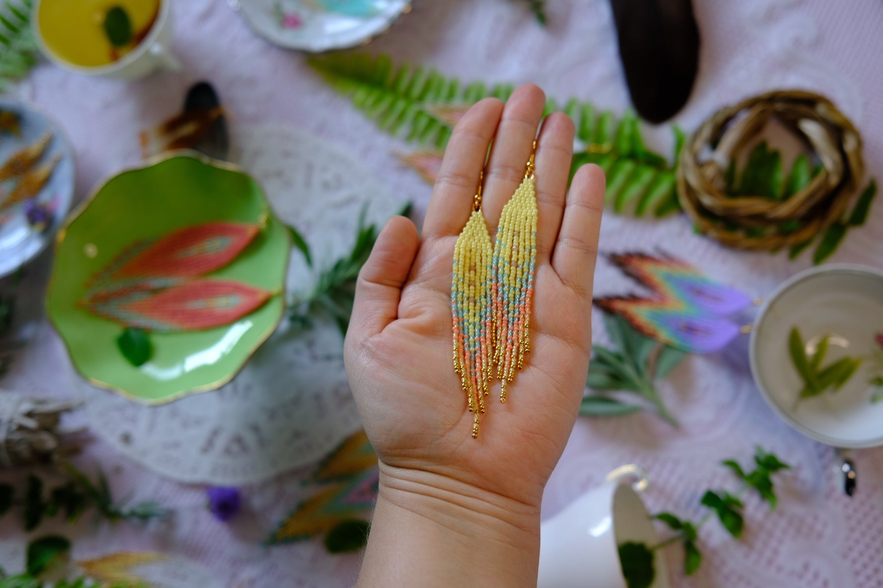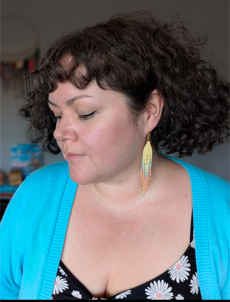 all earrings are handmade by me in small batches with good energy and heart. they hang on either gold plated nickel free or surgical steel nickel free hooks, extra strong beading wire tops, nylon beading thread fringe. although they are beaded with durability and longevity in mind, they are still delicate pieces of glass and should be treated with love and kindness.